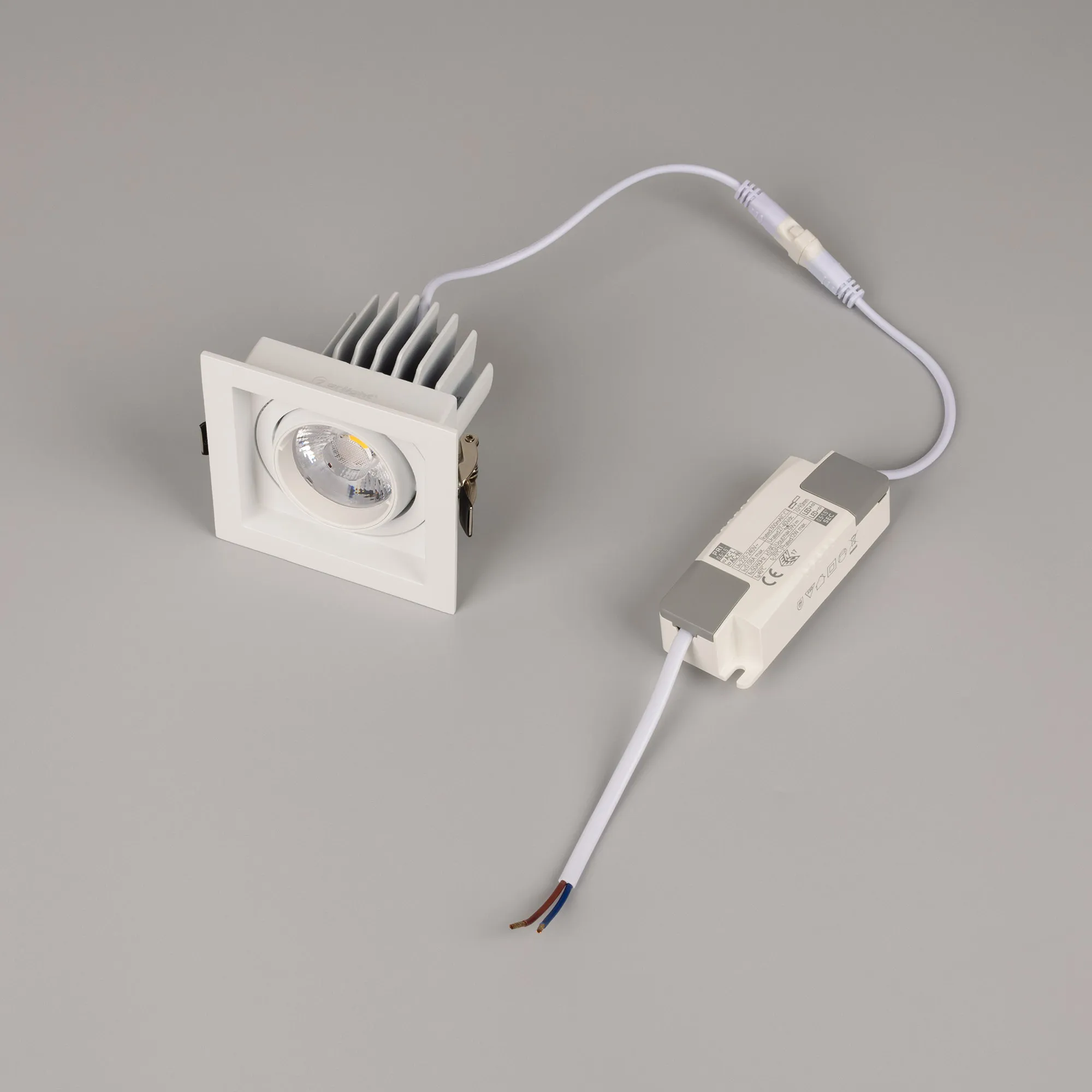 лм/Вт, дневной 4000 K, CRI>92, угол 20°, напряжение питания 230 В. Белый корпус из алюминия, белая вставка, степень защиты IP20. Размер: длина 90 мм, ширина 90 мм, высота 80 мм. Монтаж встраиваемый, установочное отверстие: длина 75 мм, ширина 75 мм. Драйвер 27-40 В, 300 мА, пульсация <2%.