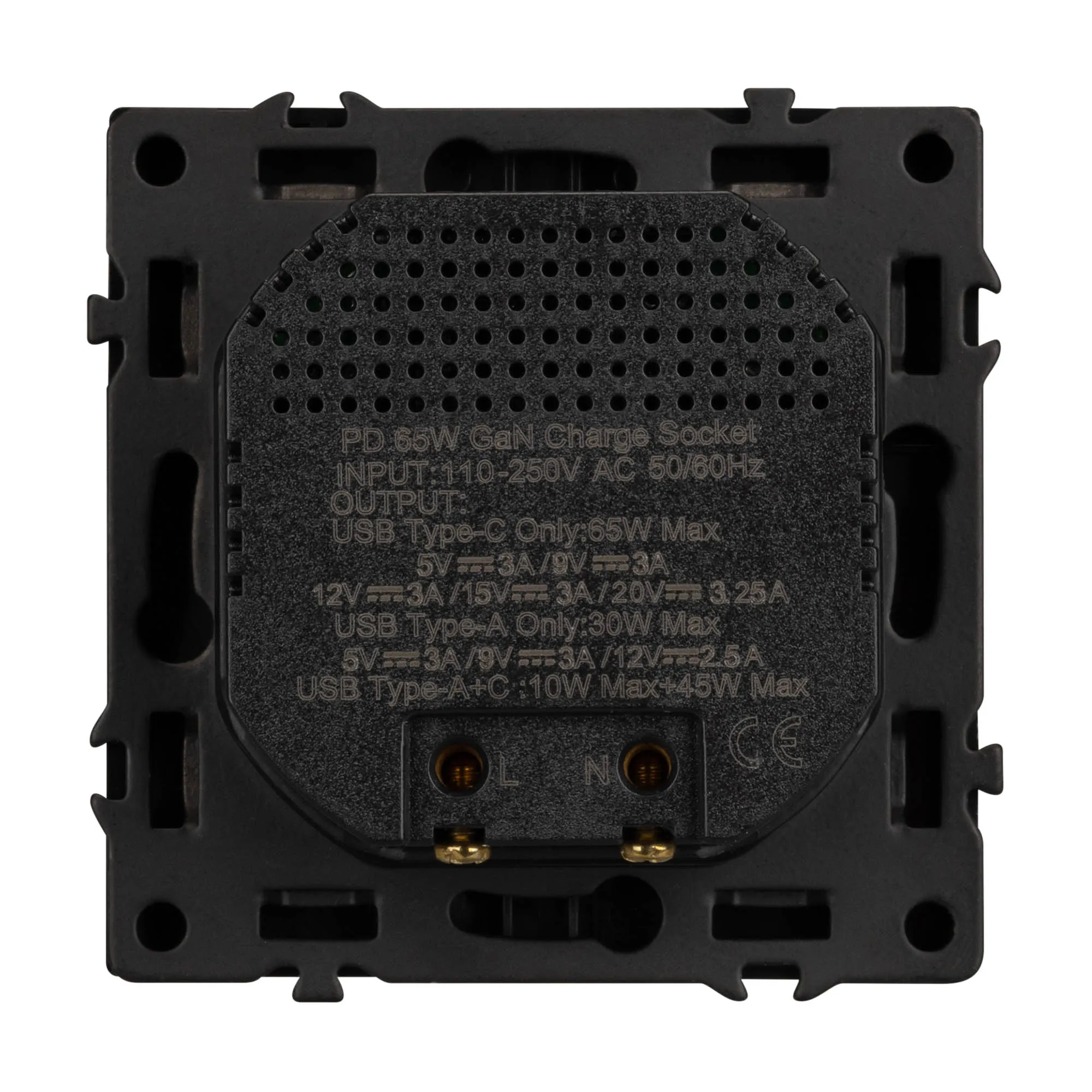 Механизм розетки с быстрой USB зарядкой на 2 порта. Цвет - черный оникс, с Soft-Touch покрытием. Без фронтальной рамки. Уровень пылевлагозащиты IP20. Тип подключаемого разъема - USB Type A + Type C. Устанавливается в стандартный подрозетник круглого сечения диаметром 60мм.
