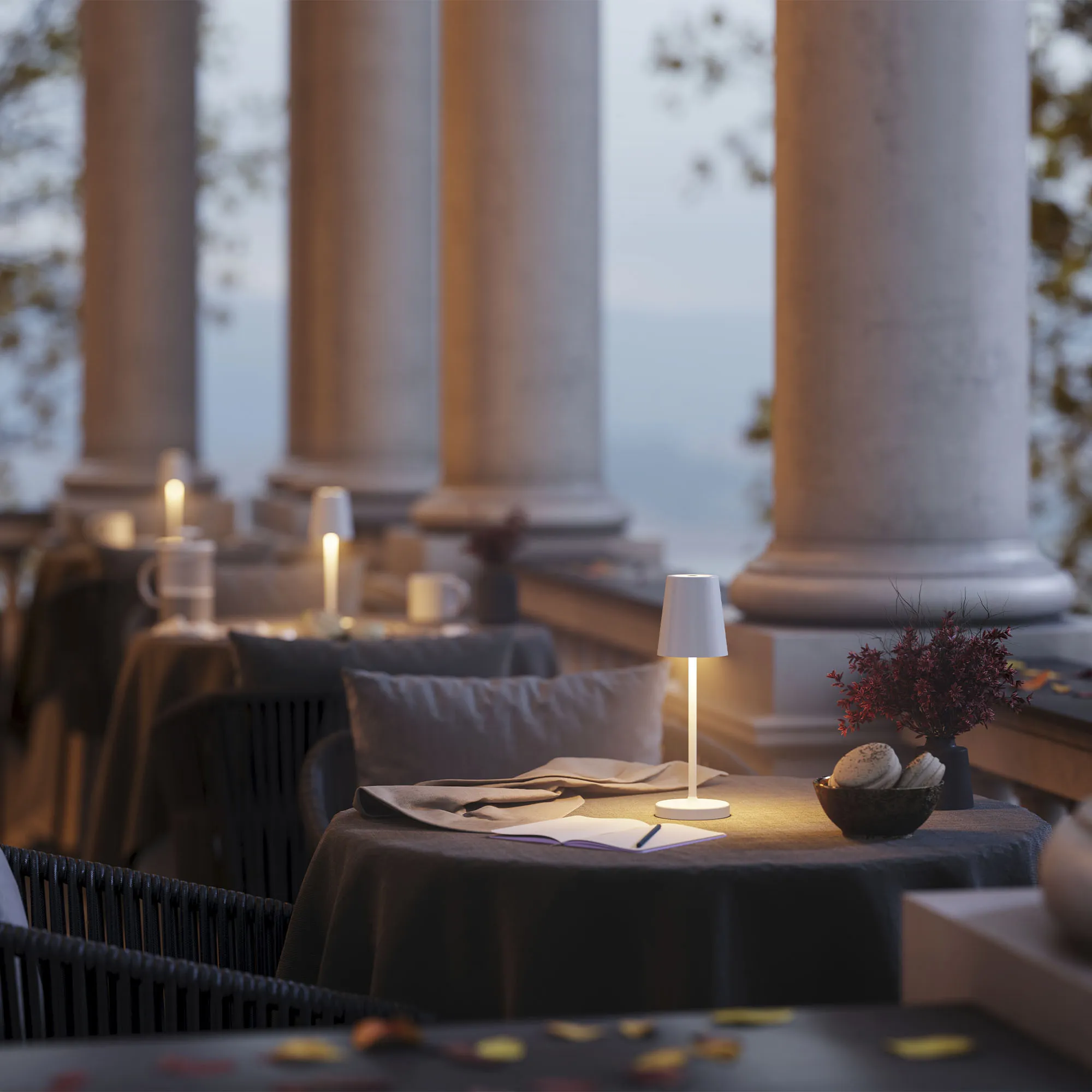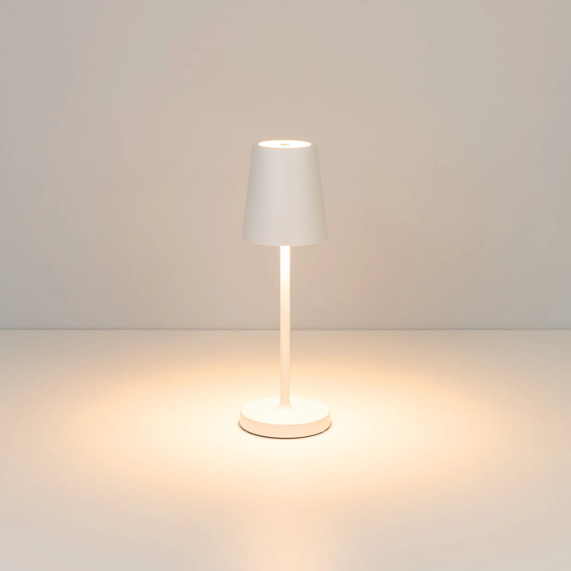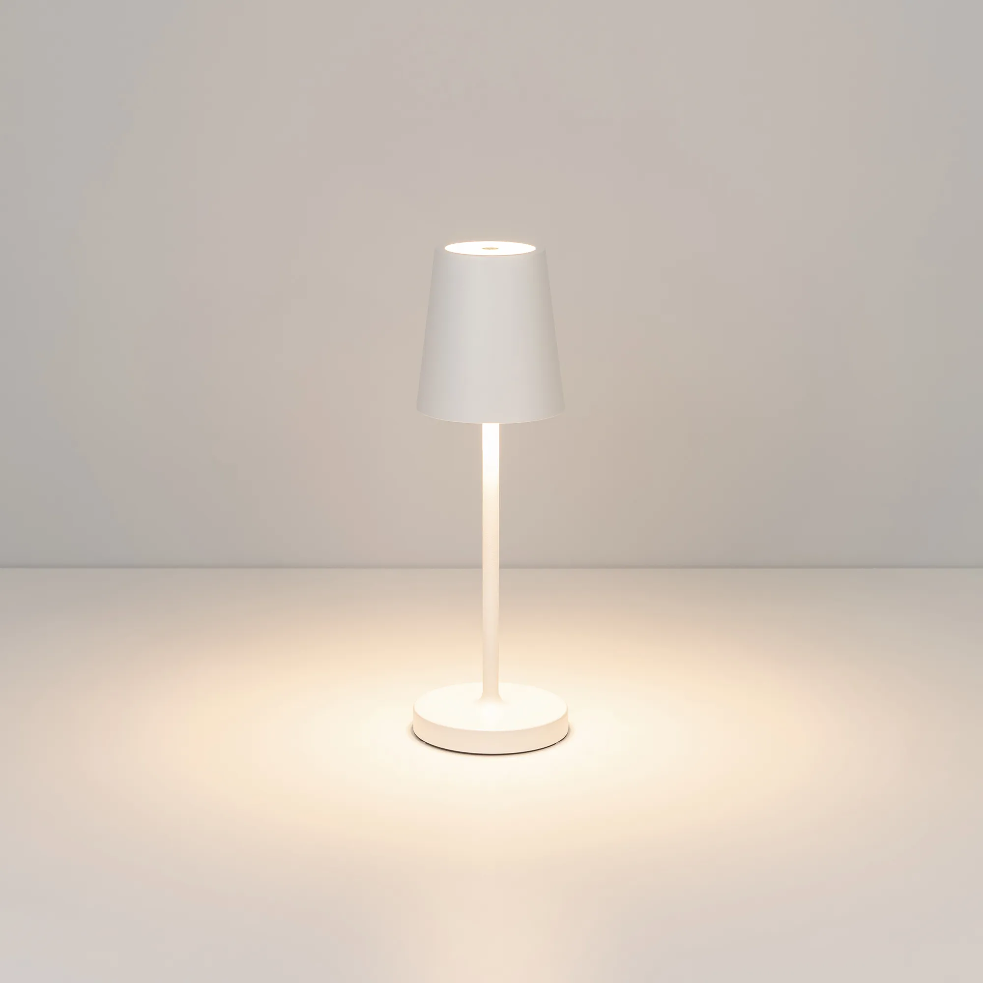 Настольный светильник со встроенным аккумулятором 1.5Вт, алюминиевый корпус, цвет белый. Цвет ТЕПЛЫЙ БЕЛЫЙ 2200-2700-3000K, св.поток 110-130 лм, CRI(Ra)>80, угол 90°. Размер Ф75x250мм. IP54. Зарядка от сети переменного тока AC220-240V. Тип встроенного аккумулятора 1500мАч Li-ion, напряжение батареи 3.7V
