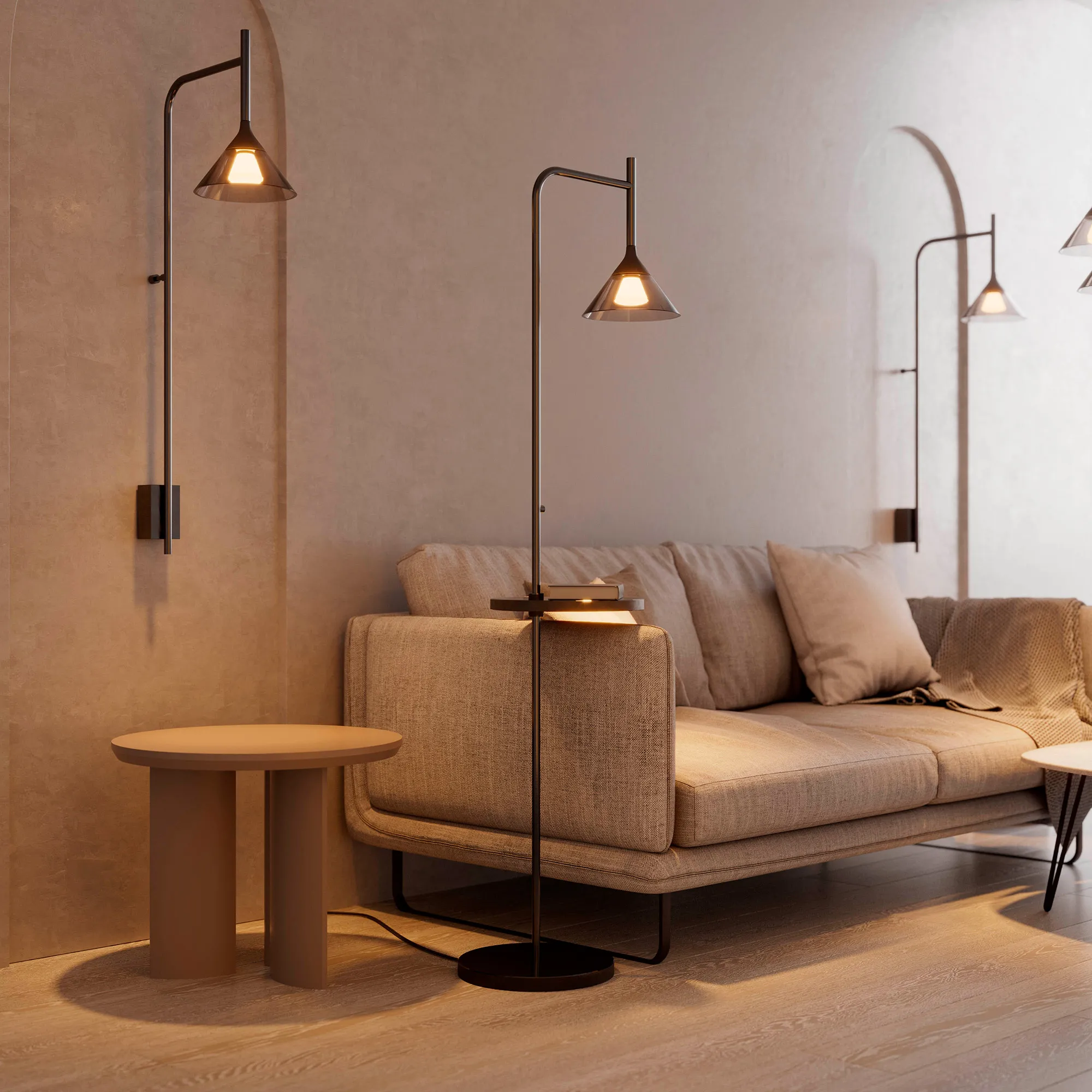 Напольный светильник. Мощность 7 Вт, св. поток 355 лм, 50 лм/Вт, теплый 3000К, CRI>94, угол 30°, напряжение питания 230 В. Черный корпус из алюминия с конусообразным стеклянным плафоном дымчатого цвета, степень защиты IP20. Размеры: диаметр плафона 200 мм, высота плафона 180 мм, диаметр напольной базы 300 мм, общая высота светильника 1590 мм. Сеносорная кнопка на ножке: короткое нажатие - on/off, длинное нажатие - регулировка яркости. Монтаж напольный, также возможна регулировка столика. Драйвер 24 В, 750 мА, пульсация <1%.