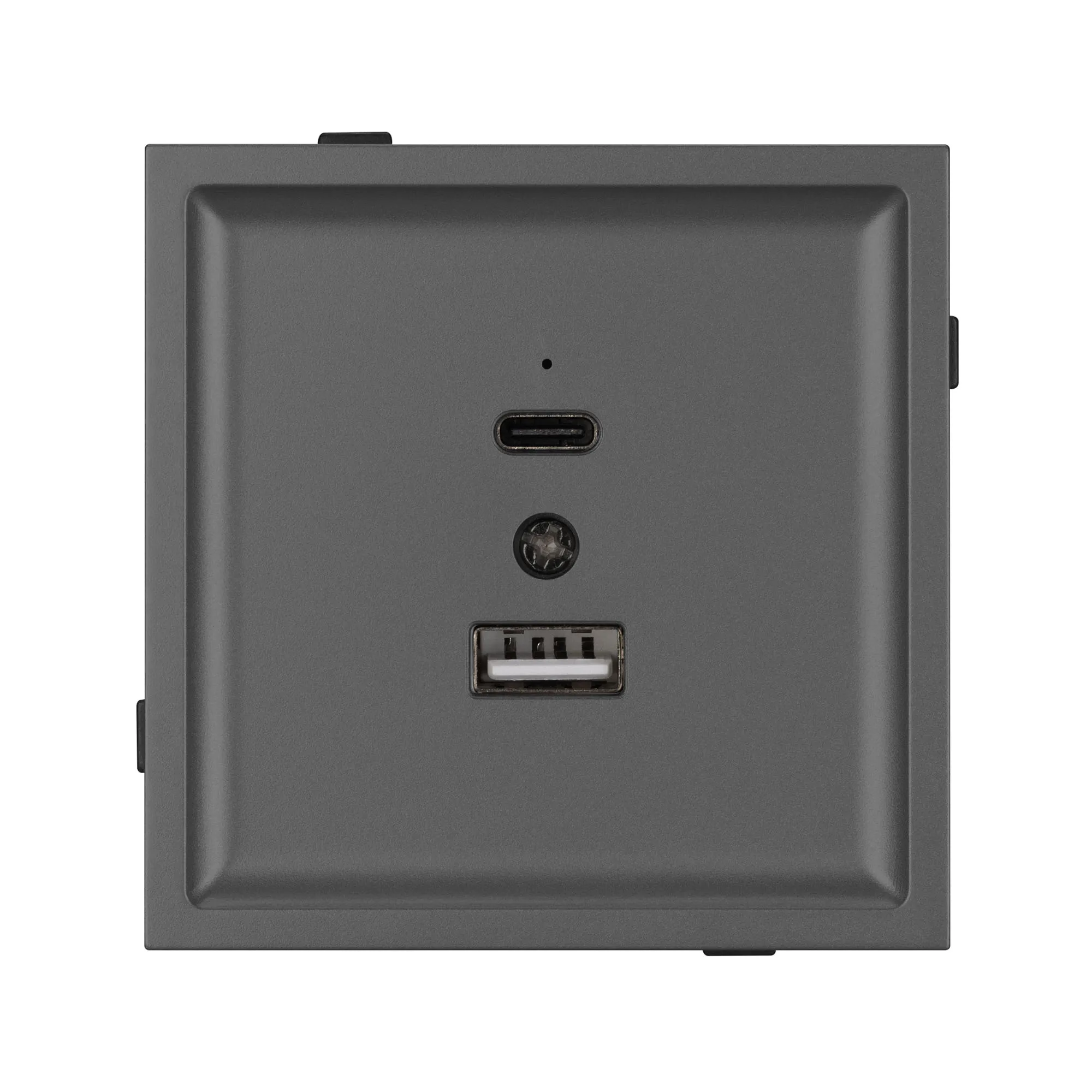 Механизм USB розетки на 2 порта Type A + Type C. Цвет - матовый графитовый, с Soft-Touch покрытием. Без фронтальной рамки. Выходная мощность для USB Type C порта не превышает 20W. Уровень пылевлагозащиты IP20. Устанавливается в стандартный подрозетник круглого сечения диаметром 60мм.