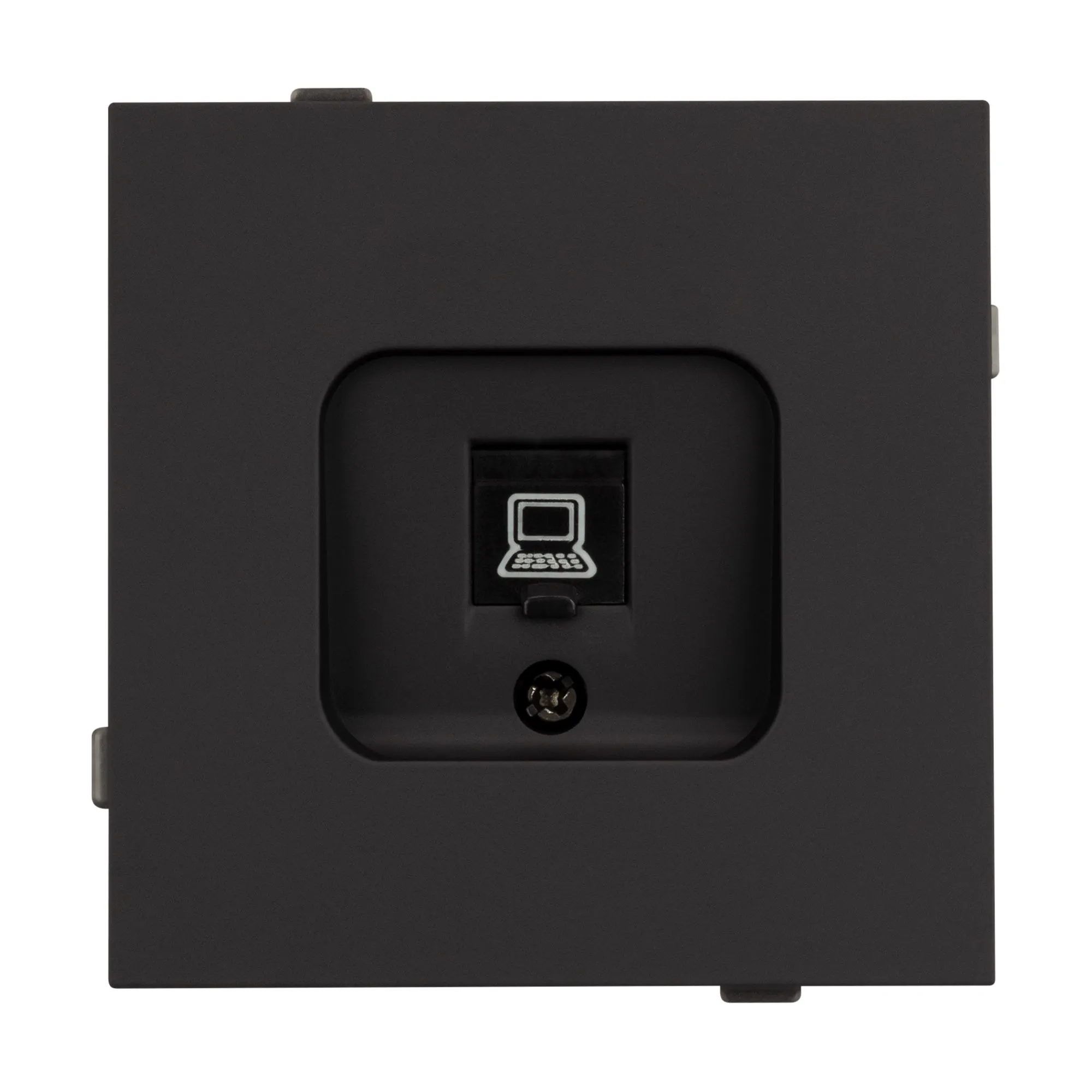Механизм компьютерной розетки на 1 пост 6-й категории. Цвет - матовый черный, с Soft-Touch покрытием. Без фронтальной рамки. Уровень пылевлагозащиты IP20. Розетка устанавливается в стандартный подрозетник круглого сечения диаметром 60мм.