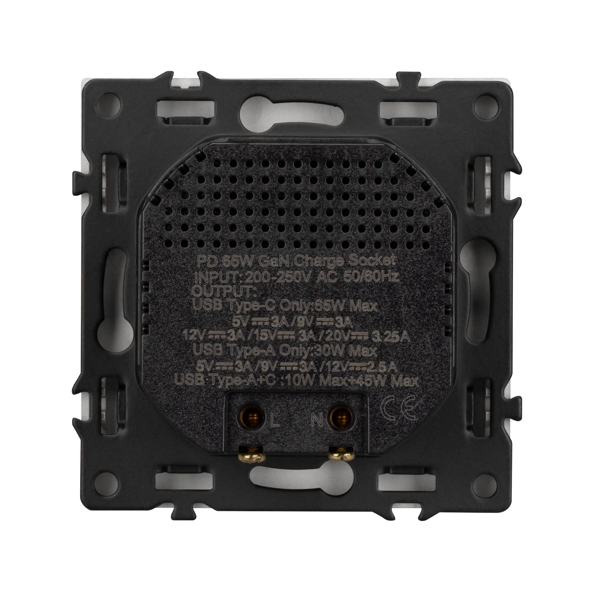 Механизм розетки с быстрой USB зарядкой на 2 порта. Цвет - никель, с Soft-Touch поверхностью. Без фронтальной рамки. Уровень пылевлагозащиты IP20. Тип подключаемого разъема - USB Type A + Type C. Устанавливается в стандартный подрозетник круглого сечения диаметром 60мм.