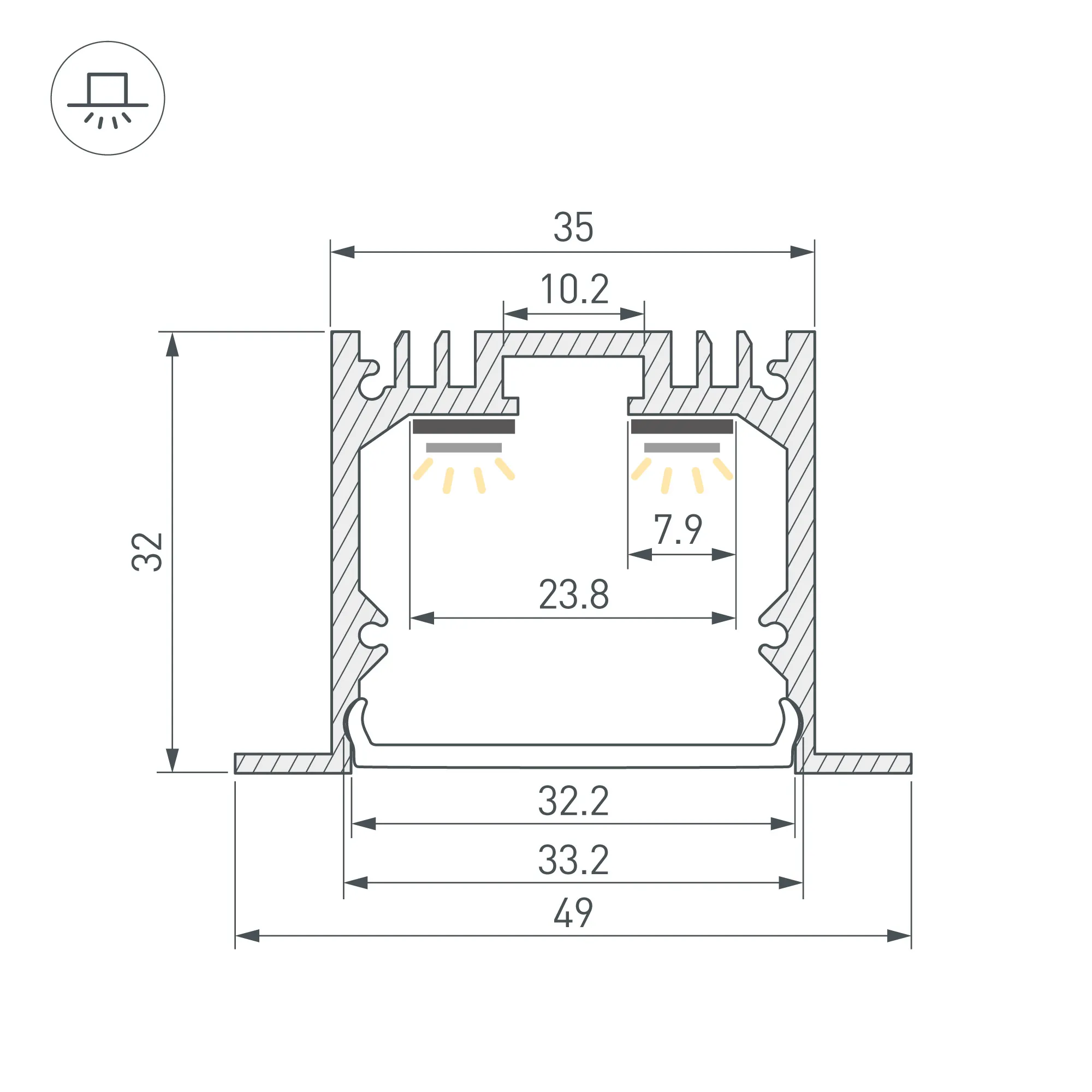 Алюминиевый анодированный профиль для светодиодных лент и линеек. Габаритные размеры (L×W×H): 3000x49x32 мм, паз для установки 35 мм. Ширина площадки для ленты 23,8 мм. Экраны, заглушки и другие аксессуары приобретаются отдельно. Цена за 1 метр.