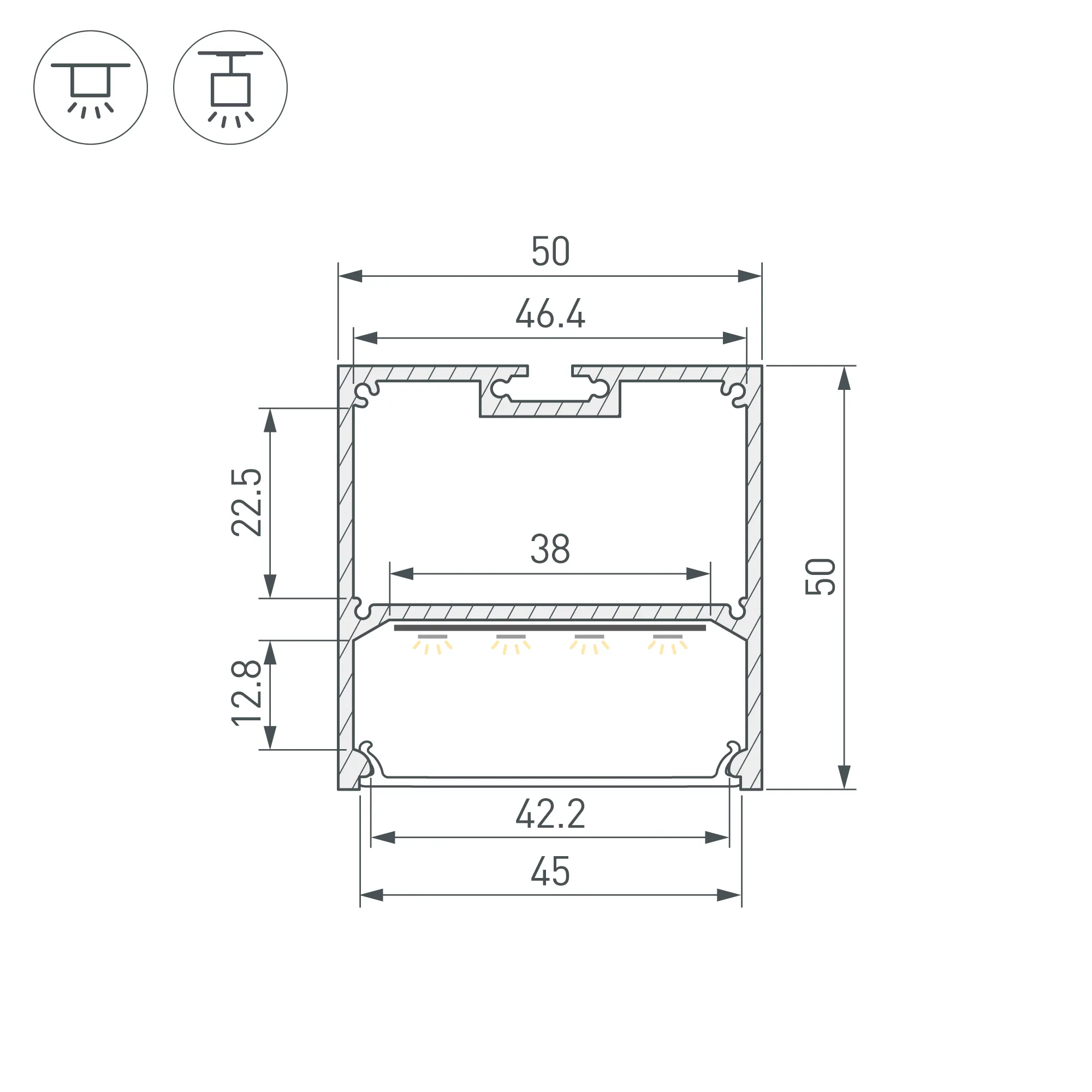 Алюминиевый анодированный профиль для светодиодных лент и линеек. Габаритные размеры (L×W×H): 3000x50x50 мм. Ширина площадки для ленты 38 мм. Отсек для БП 46,4х22,5мм. Экраны, заглушки и другие аксессуары приобретаются отдельно. Цена за 1 метр.
